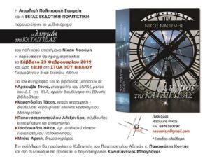 Η παρουσίαση του βιβλίου, με εκλεκτούς καλεσμένους, θα πραγματοποιηθεί το Σάββατο 23 Φεβρουαρίου 2019 και ώρα 18:30, στη Στοά του Βιβλίου ( Πεσμαζόγλου 5 και Σταδίου ), στο κέντρο της Αθήνας.