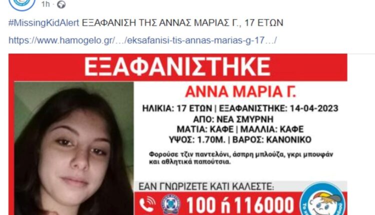 Στις 14 Απρι­λί­ου 2023, εξα­φα­νί­στη­κε από τη Μονά­δα Κοι­νω­νι­κής Φρο­ντί­δας Παι­δό­πο­λη «Αγία Βαρ­βά­ρα», στην περιο­χή της Νέας Σμύρ­νης, η Άννα Μαρία Γ., 17 ετών. Το «Χαμό­γε­λο του Παι­διού» ενη­με­ρώ­θη­κε σήμε­ρα, 20/04/2023, από τις Αρμό­διες Αστυ­νο­μι­κές Αρχές…