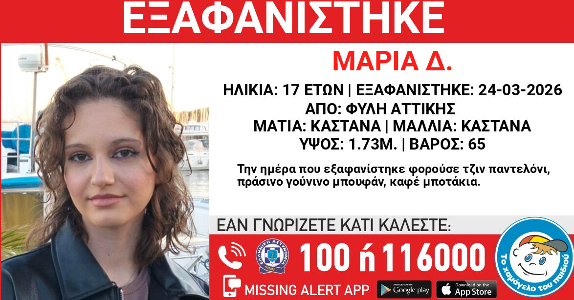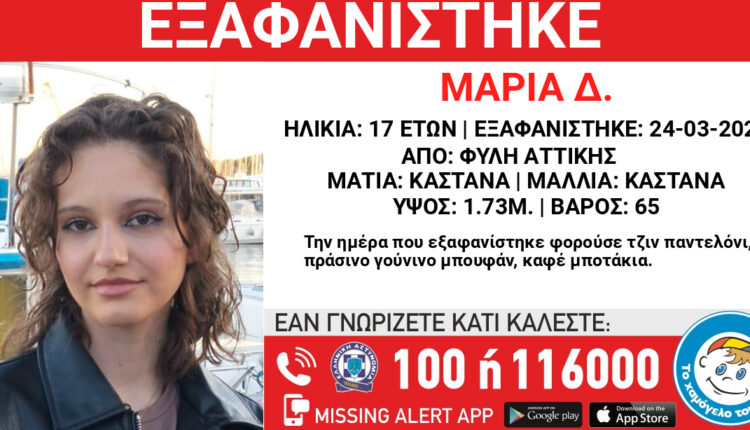 Συναγερμός έχει σημάνει στις αρχές για την εξαφάνιση 17χρονης από την περιοχή της Φυλής. Πρόκειται για την 17χρονης Μαρία μαθήτρια Λυκείου τα ίχνη της οποίας χάθηκαν το μεσημέρι της περασμένης Τρίτης από την περιοχή της Φυλής…