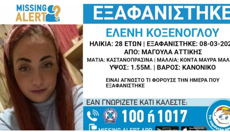 Η 28χρονη Ελέ­νη Κοξέ­νο­γλου εξα­φα­νί­στη­κε από τη Μαγού­λα στις 8 Μαρ­τί­ου 2024. «Το Χαμό­γε­λο του Παι­διού» ενη­με­ρώ­θη­κε για την εξα­φά­νι­ση της 28χρονης σήμε­ρα και προ­χώ­ρη­σε άμε­σα, κατό­πιν αιτή­μα­τος της οικο­γέ­νειάς της, στη δημο­σιο­ποί­η­ση των στοι­χεί­ων της ενήλικης…