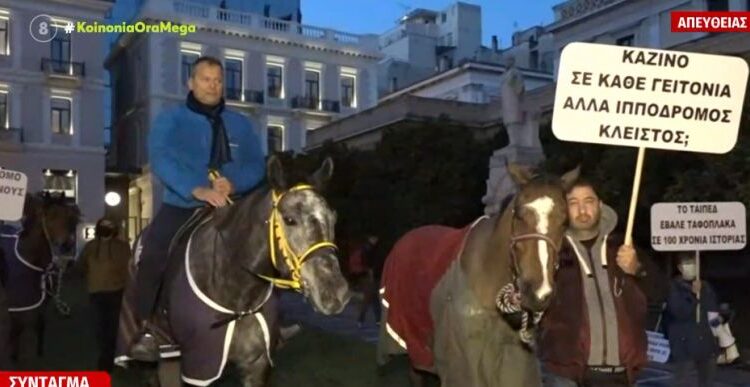 Στην παλιά Βουλή μαζεύτηκαν για να διαμαρτυρηθούν μαζί με τα άλογά τους εργαζόμενοι από τον Ιππόδρομο