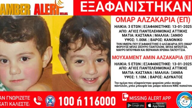 Μία διπλή εξαφάνιση μικρών παιδιών από τον Άγιο Παντελεήμονα Αττικής σήμανε συναγερμό στις αρχές. Πρόκειται για τον Ομάρ Αλζακαρία 3 ετών και τον Μουχάμεντ Αμίν Αλζακαρία 5 χρόνων, όπως ανακοίνωσε την Τετάρτη (22.01.2025) το «Χαμόγελο του Παιδιού»…
