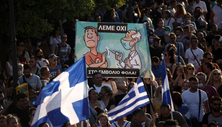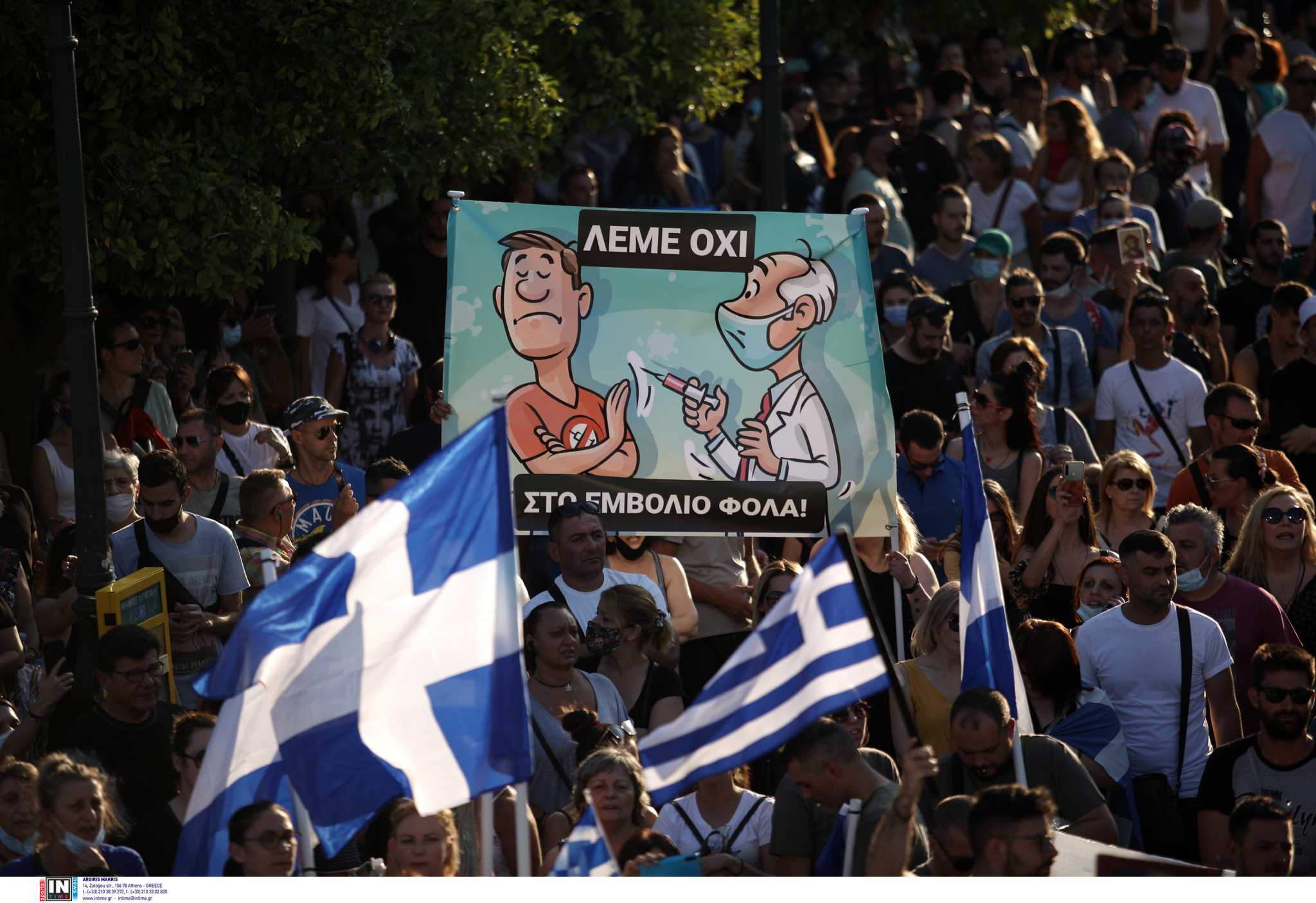 Εκατοντάδες άτομα συγκεντρώθηκαν σε Σύνταγμα και Ομόνοια για να διαμαρτυρηθούν για τα εμβόλια κατά του κορονοϊού και τα μέτρα για την υποχρεωτικότητά τους, κρατώντας πανό με συνθήματα και ελληνικές σημαίες.