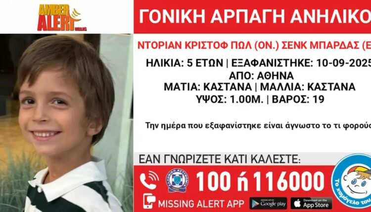 Συναγερμό σήμανε το «Χαμόγελο του Παιδιού» για την αρπαγή 5χρονου από τη μητέρα του στην Αθήνα. Όπως επισημαίνει ο οργανισμός σε ανακοίνωσή του: «Στις 10/09/2025 η μητέρα προέβη σε αρπαγή του ανήλικου Μπάρδα Σενκ (επ.) Ντόριαν Κρίστοφ Πωλ (ον.), 5 ετών, από την περιοχή της Αθήνας και έκτοτε αγνοούνται…