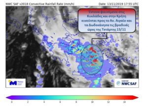 Από τη νύχτα η κακοκαιρία έχει περάσει από το Αιγαίο και την Κρήτη και κατευθύνθηκε προς τα Δωδεκάνησα, όπου το φαινόμενο μετά το μεσημέρι θα εξασθενήσει.