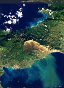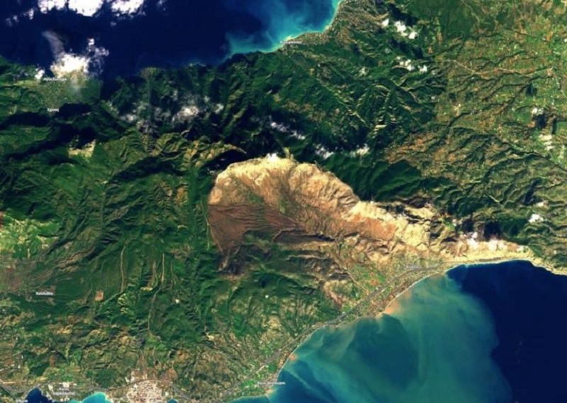 Η φωτογραφία αποκαλύπτει την αλλαγή του χρώματος της επιφάνειας της θάλασσας από τις απορροές των χειμάρρων στην περιοχή, ενώ διακρίνονται και οι καμένες εκτάσεις στην Κινέττα από τη μεγάλη πυρκαγιά του περυσινού Ιουλίου.