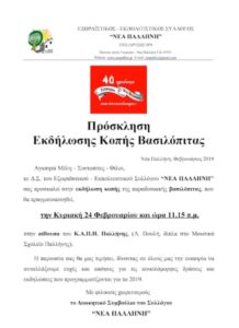 Αγαπητά Μέλη – Συντοπίτες – Φίλοι, το Δ.Σ. του Εξωραϊστικού – Εκπολιτιστικού Συλλόγου “ΝΕΑ ΠΑΛΛΗΝΗ” σας προσκαλεί στην εκδήλωση κοπής της παραδοσιακής βασιλόπιτας, που θα πραγματοποιηθεί, την Κυριακή 24 Φεβρουαρίου και ώρα 11.15 π.μ. στην αίθουσα του Κ.Α.Π.Η. Παλλήνης, (Λ. Πουλή, δίπλα στο Μουσικό Σχολείο Παλλήνης).