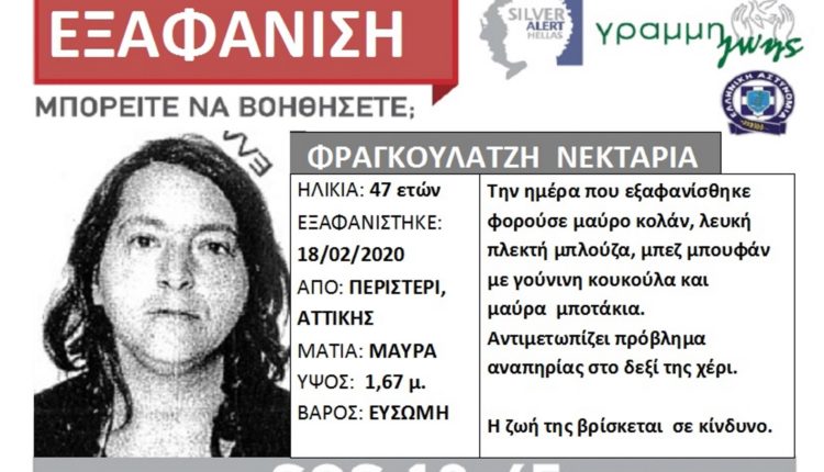 Η Νεκτα­ρία Φρα­γκου­λα­τζή, 47 χρό­νων, από το Ρέθυ­μνο, αγνο­εί­ται από την Τετάρ­τη 19 Φεβρουα­ρί­ου. Μια ημέ­ρα πριν, έφυ­γε από το δια­μέ­ρι­σμα της αδελ­φής της στα Σεπό­λια που τη φιλο­ξε­νού­σε, λέγο­ντας πως θα πάει στο σπί­τι του παι­δι­κού της φίλου Κώστα και στην ηλι­κιω­μέ­νη μητέ­ρα του.