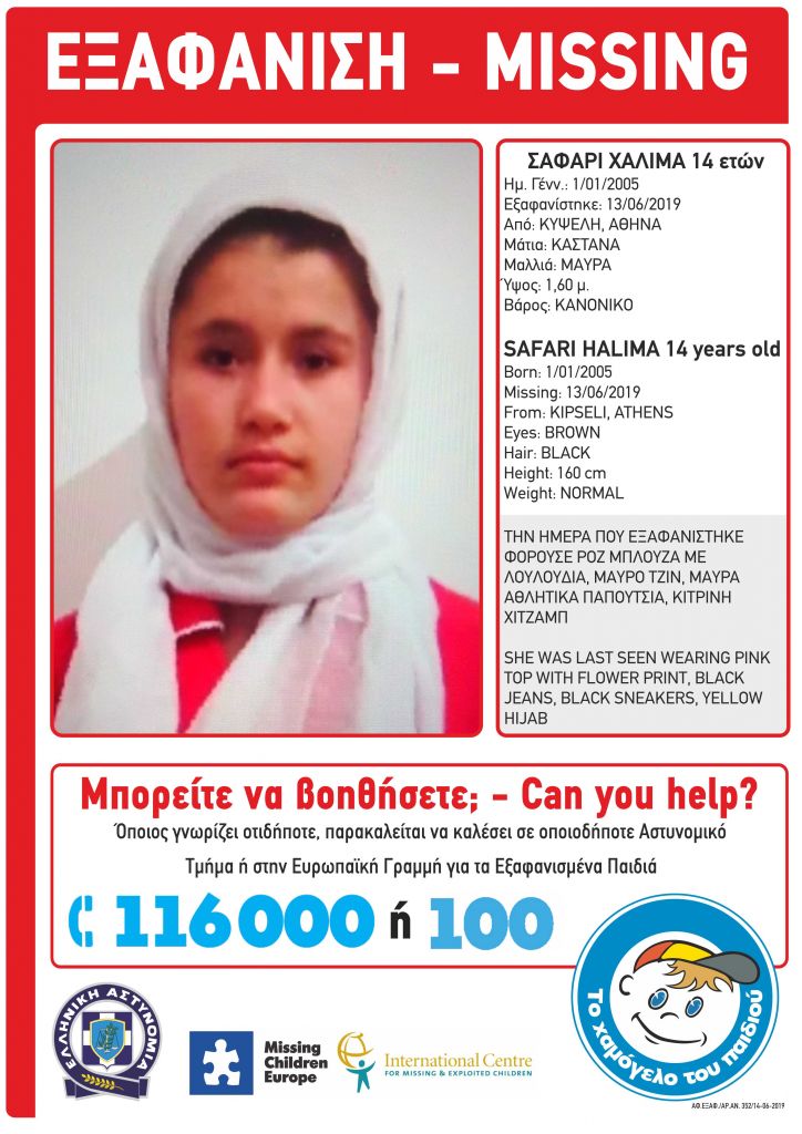 Εξαφανίστηκε την Πέμπτη από το σπίτι της στην Κυψέλη η 14χρονη Χαλιμά Σαφάρι, 14 ετών, αφγανικής καταγωγής, για την οποία εξεδόθη Missing Alert από το Χαμόγελο του Παιδιού.