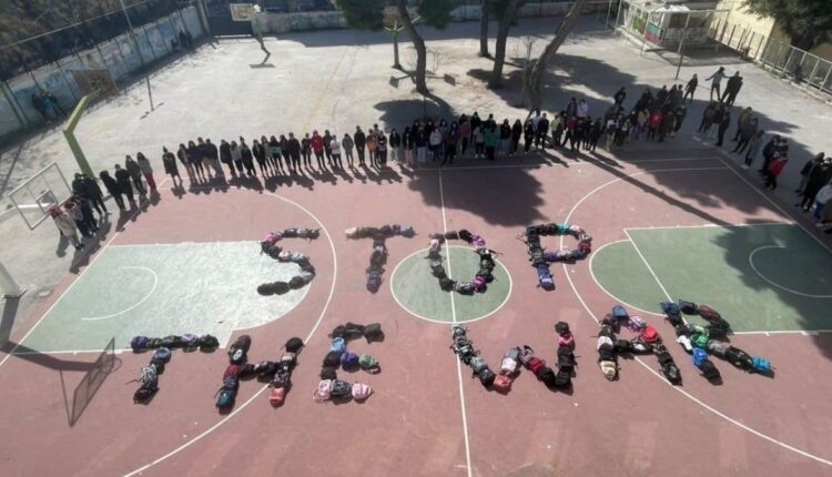 Όπως φαίνεται η φωτογραφία που αναρτήθηκε στο Facebook οι μαθητές σχημάτισαν με τις τσάντες τους το μήνυμα «Σταματήστε τον πόλεμο».