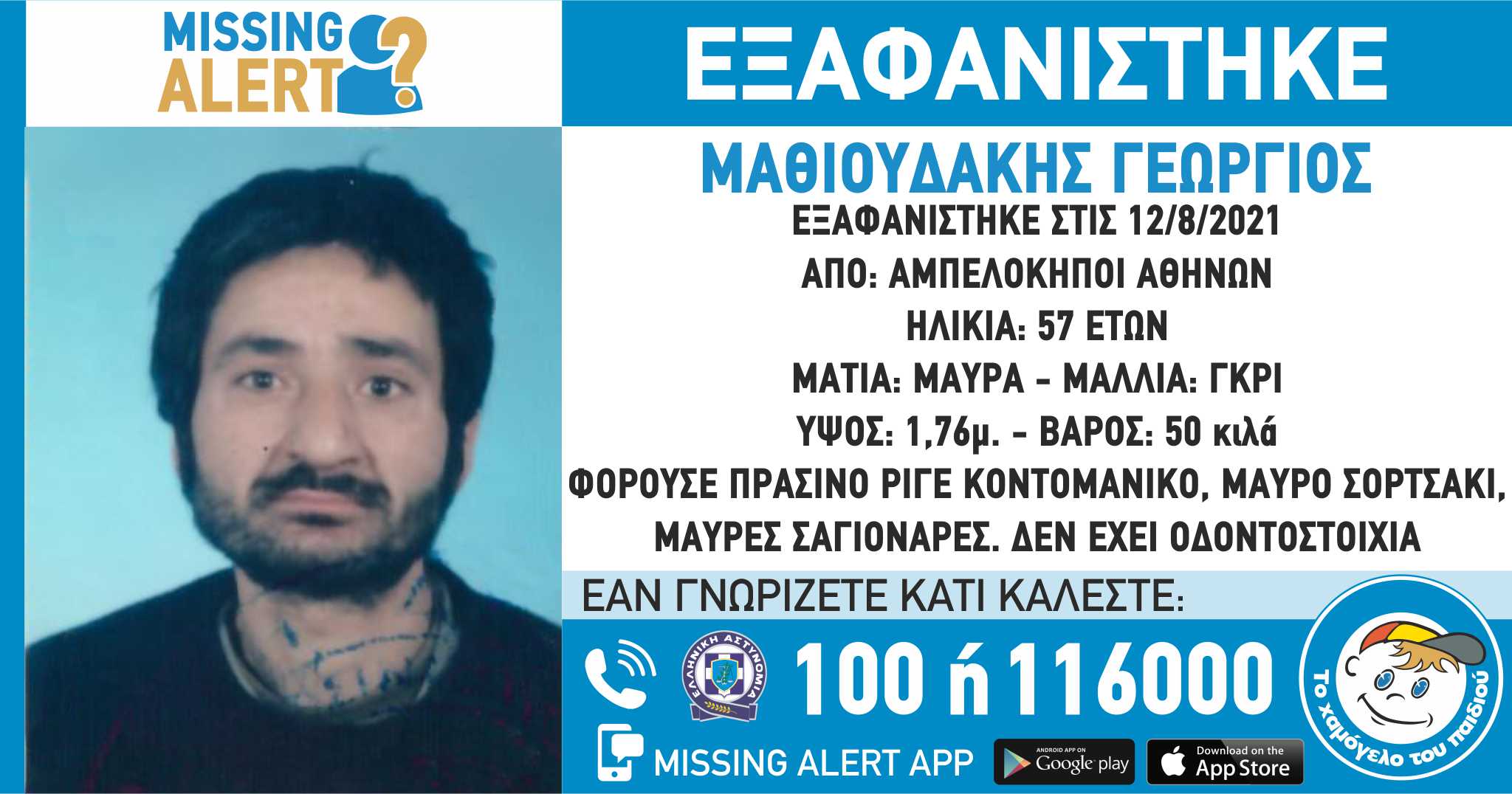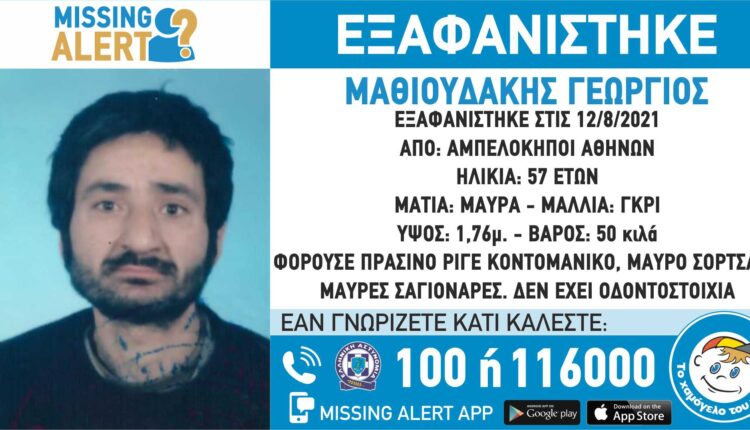 Εκδό­θη­κε Missing Alert που ανα­φέ­ρει ότι: Στις 12/8/2021, εξα­φα­νί­στη­κε από την περιο­χή των Αμπε­λο­κή­πων Αθή­νας, ο Μαθιου­δά­κης Γεώρ­γιος, 57 ετών.