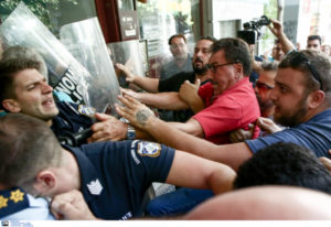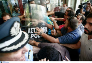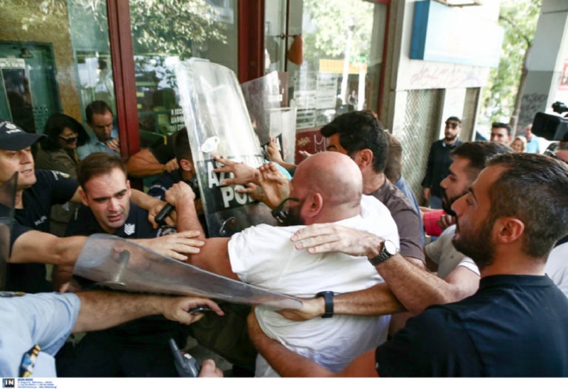 Από νωρίς μέλη του ΠΑΜΕ βρέθηκαν έξω από το συμβολαιογραφείο για να συμπαρασταθούν στην οικογένεια και κάποια στιγμή προκλήθηκε ένταση και οι συγκεντρωμένοι συνεπλάκησαν με τους αστυνομικούς.