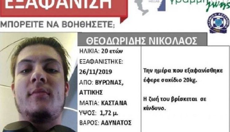 Την εξαφάνιση του 20χρονου Νικόλαου Θεοδωρίδη γνωστοποίησε η Γραμμή Ζωής.