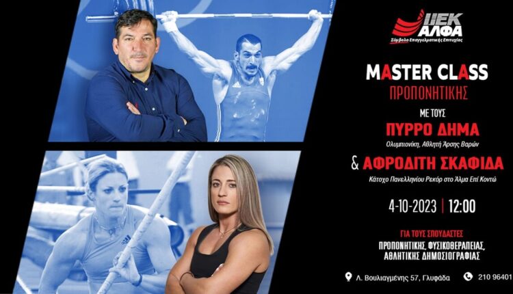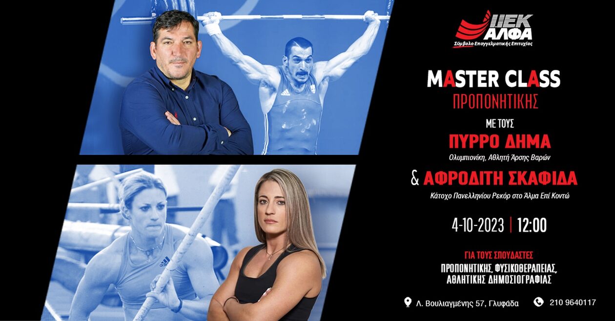 Δυναμικό comeback για τη νέα ακαδημαϊκή χρονιά έκανε ο Τομέας Προπονητικής του ΙΕΚ ΑΛΦΑ Γλυφάδας, διοργανώνοντας Δωρεάν MasterClass, με εισηγητές τον κορυφαίο Έλληνα αθλητή της άρσης βαρών & Ολυμπιονίκη ΠΥΡΡΟ ΔΗΜΑ και την αθλήτρια στο άλμα επί κοντώ ΑΦΡΟΔΙΤΗ ΣΚΑΦΙΔΑ (κάτοχο του Πανελληνίου Ρεκόρ, με την 4η καλύτερη επίδοση στην Ευρώπη και 9η στον κόσμο)…