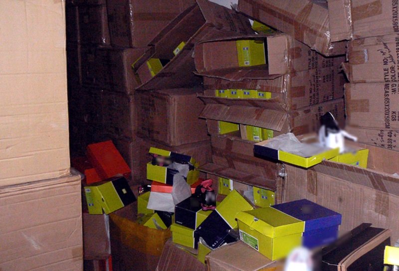 Κατά τον έλεγ­χο του εμπο­ρευ­μα­το­κι­βω­τί­ου, εντο­πί­στη­καν και κατα­σχέ­θη­καν 6.672 ζευ­γά­ρια αθλη­τι­κά υπο­δή­μα­τα ΝΙΚΕ και 1.260 ζευ­γά­ρια ADIDAS. Επί­σης, κατα­σχέ­θη­καν εντός του εμπο­ρευ­μα­το­κι­βω­τί­ου και 36 χαρ­το­κι­βώ­τια, τα οποία περιεί­χαν 432 ζεύ­γη ανώ­νυ­μα υπο­δή­μα­τα, τα οποία χρη­σι­μο­ποι­ή­θη­καν ως προ­κά­λυμ­μα («τάπα») από τους παρά­νο­μους εισα­γω­γείς, για να απο­κρύ­ψουν τα απο­μι­μη­τι­κά υπο­δή­μα­τα και να παρα­πλα­νή­σουν τις τελω­νεια­κές αρχές.