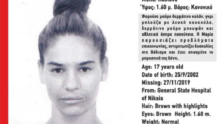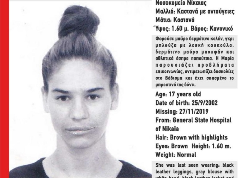 “Στις 27/11/2019 και ώρα 11:00, εξαφανίστηκε από το Γενικό Κρατικό Νοσοκομείο Νίκαιας, η Μαρία Θ., 17 ετών” αναφέρει το Χαμόγελο του Παιδιού για μια ακόμη εξαφάνιση ανηλίκου που προκαλεί μεγάλη ανησυχία.
