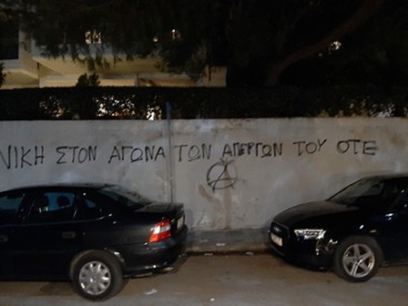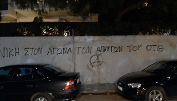 Συνθήματα έξω από το σπίτι του διευθύνοντος συμβούλου του ΟΤΕ Μιχάλη Τσαμάζ, στα Μελίσσια, έγραψαν μέλη του Ρουβίκωνα, τα οποία πέταξαν και τρικάκια που αναφέρονται στην απεργία διαρκείας των εργαζομένων στην επιχείρηση και την αντιμετώπισή τους από την εργοδοσία.