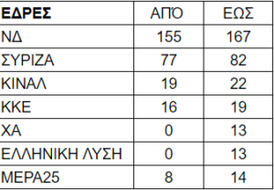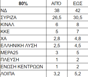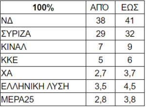 Το Κίνη­μα Αλλα­γής από 7% έως 9%, το ΚΚΕ από 5% έως 6%, η Χρυ­σή Αυγή από 2,7% έως 3,7%, η Ελλη­νι­κή Λύση από 3,5% έως 4,5% και το Μέρα 25 από 2,8% έως 3,8%.