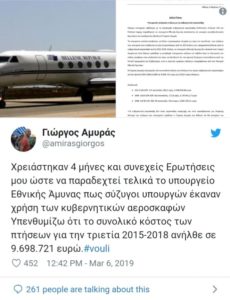 Το συνολικό κόστος των πτήσεων των τριών κυβερνητικών αεροσκαφών για την τριετία 2015–2018 ανήλθε σε 9.698.721 ευρώ για 2.032,4 ώρες πτήσεων, επισημαίνει ο κ. Αμυράς.
