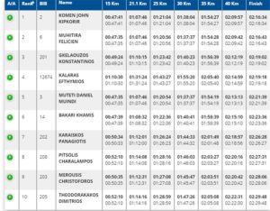 Αναλυτικά, ο Τζον Κιπκορί Κόμεν τερμάτισε πρώτος με χρόνο 2:16:34. Ο 42χρονος Κενυάτης δρομέας έφτασε πρώτος στο Παναθηναϊκό Στάδιο έχοντας προσπεράσει τον συμπατριώτη του, Φελισιέν Μουχιτίρα, μόλις 600 μέτρα πριν τον τερματισμό!